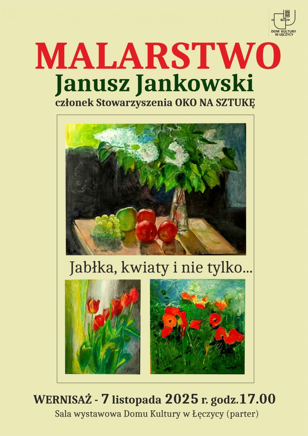 Wystawa „Jabłka, kwiaty i nie tylko" to pierwsza indywidualna wystawa prac pana Janusza, prezentować będzie obrazy akrylowe powstałe w latach 2011-2025.W jaki sposób tytuł wystawy odda charakter prac trzeba się przekonać na własne oczy – w piątek, 7 listopada o godz.17.00 w sali wystawowej na parterze.