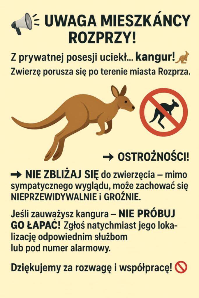 - Jeśli zauważysz kangura – NIE PRÓBUJ GO ŁAPAĆ! Zgłoś natychmiast jego loka-lizację odpowiednim służbom lub pod numer alarmowy - zaapelowali do mieszkańców urzędnicy z Rozprzy.