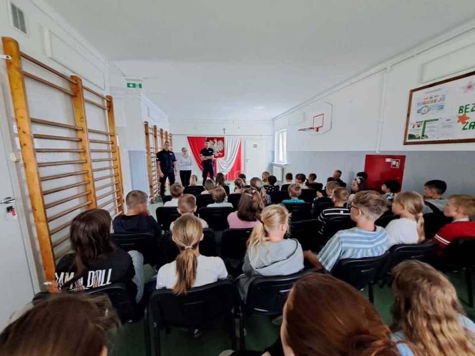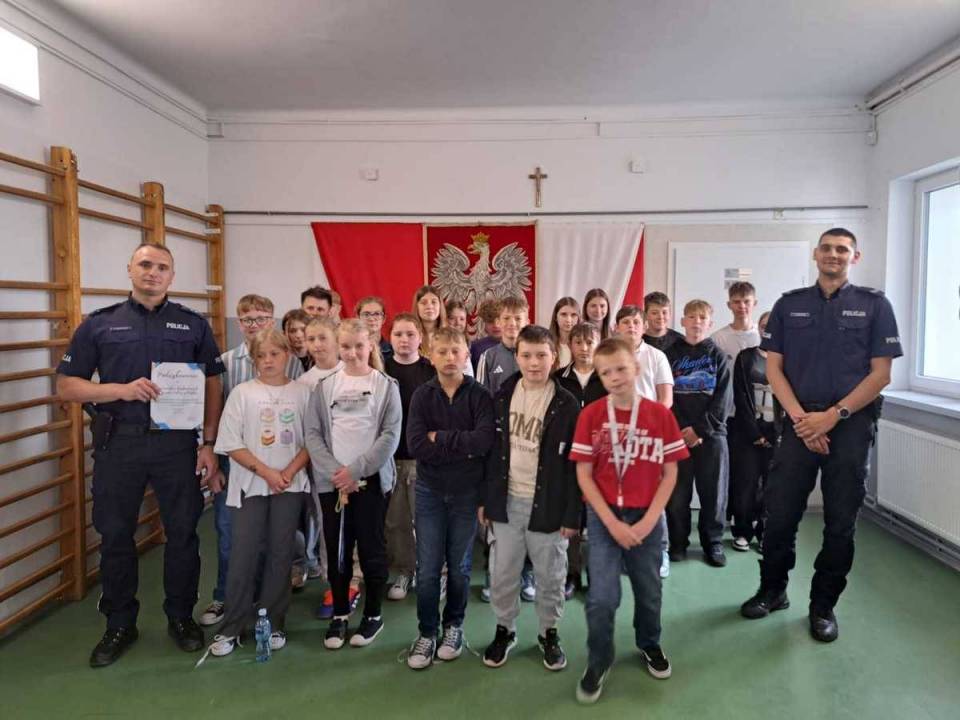 Mundurowi przypomnieli dzieciom podstawowe zasady bezpieczeństwa w ruchu drogowym – zarówno podczas poruszania się po drogach, jak i przebywania w ich pobliżu. Omówili także potencjalne zagrożenia, na jakie można natknąć się w internecie oraz w kontaktach z obcymi osobami.