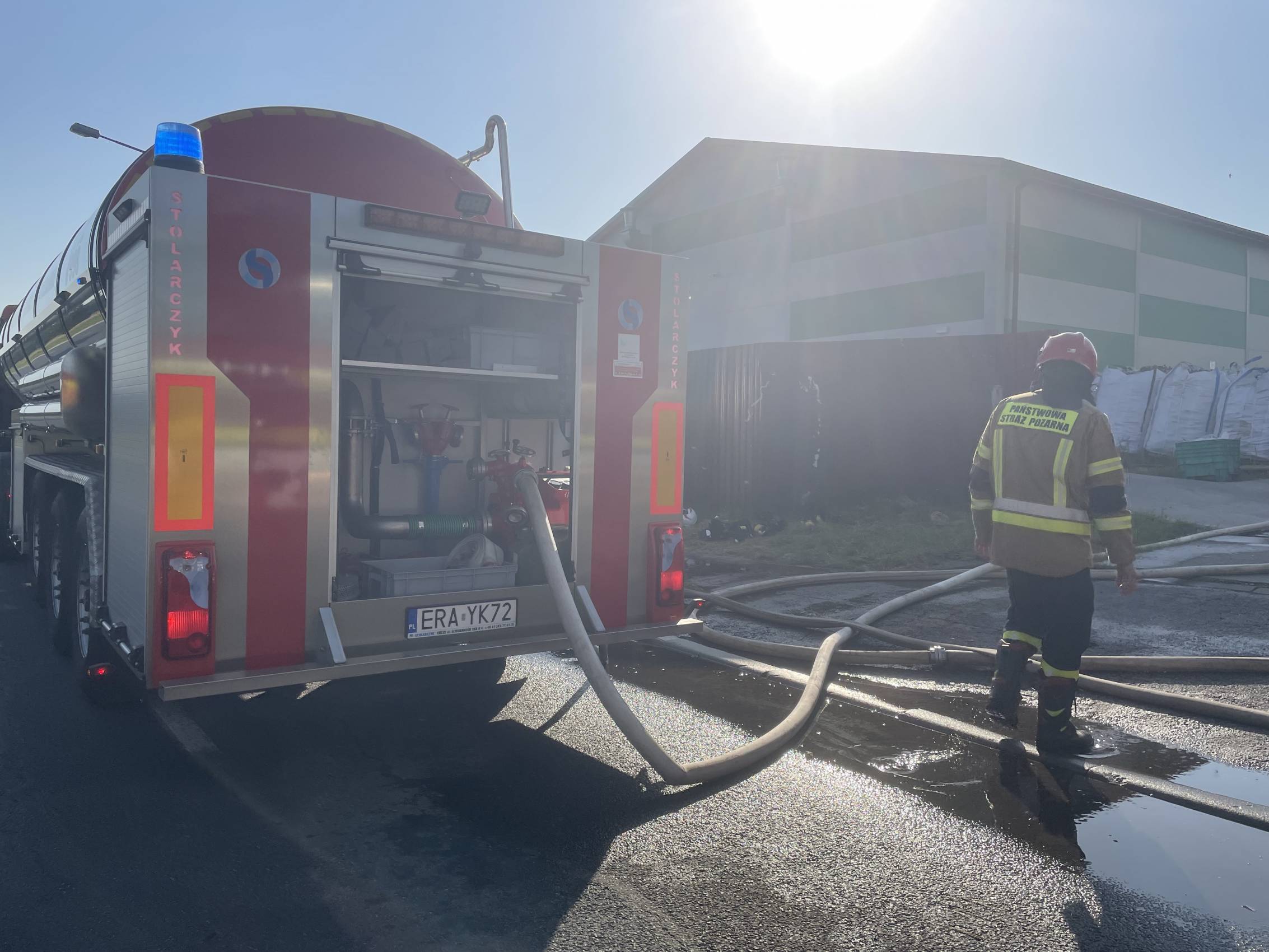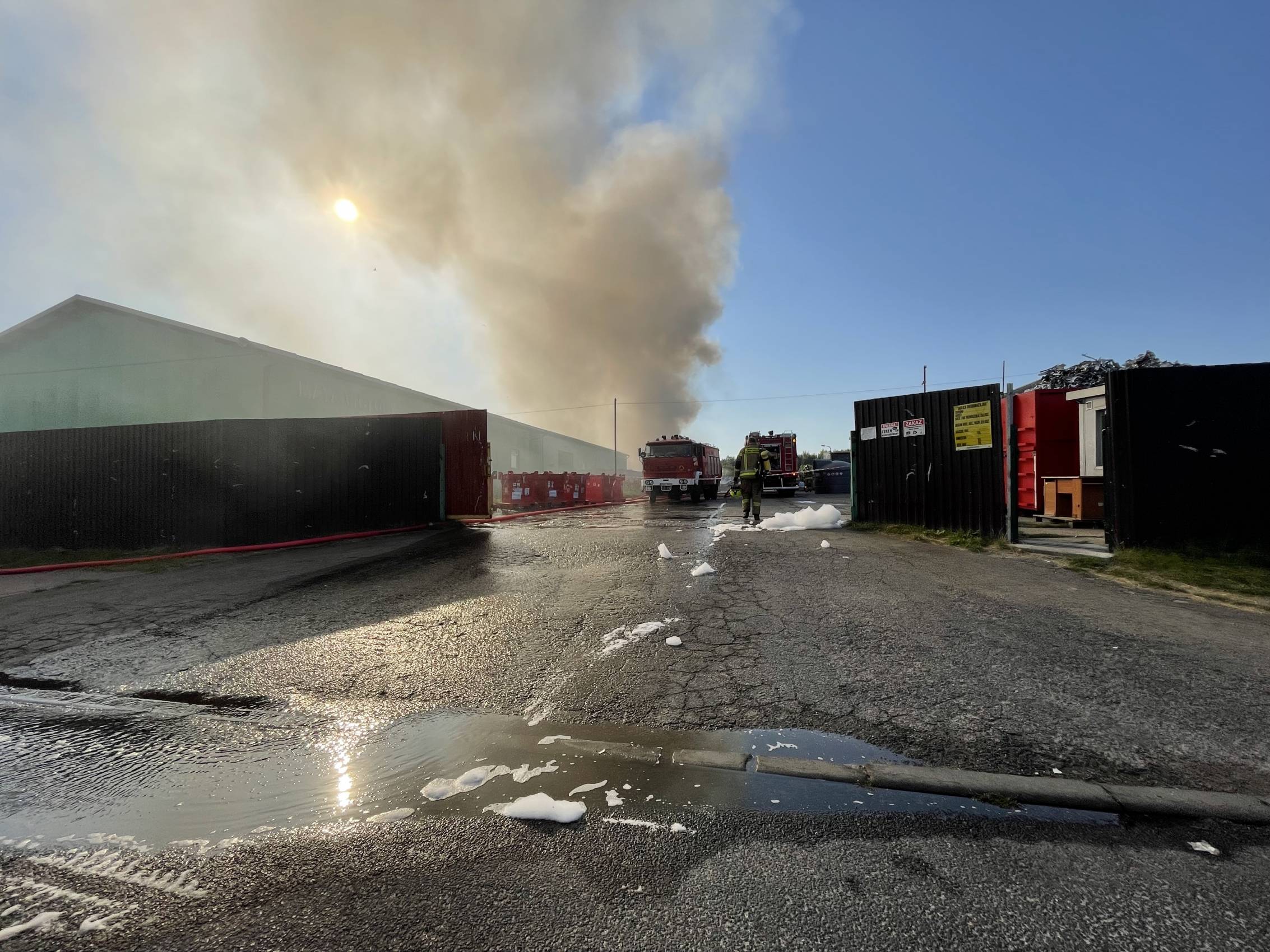 Obecnie działania strażaków koncentrują się na dotarciu do źródła ognia. Sytuację utrudnia zawalony dach hali, który uniemożliwia wejście ratowników do wnętrza budynku.