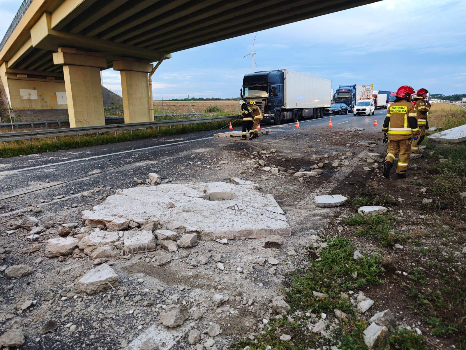 W wyniku zderzenia ciężarówka przewróciła się na bok, a przewożony ładunek – betonowe elementy szamba – rozsypał się na pas autostrady prowadzący w kierunku Warszawy.