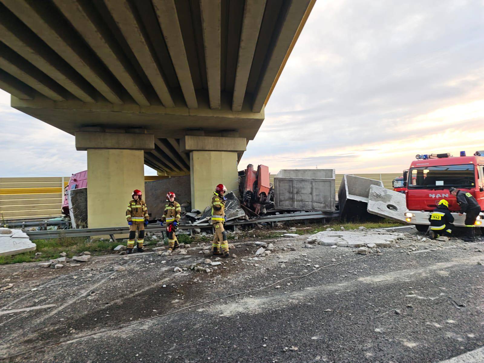 Poważny wypadek na A2. Ciężarówka uderzyła w wiadukt – ładunek rozsypał się na autostradzie