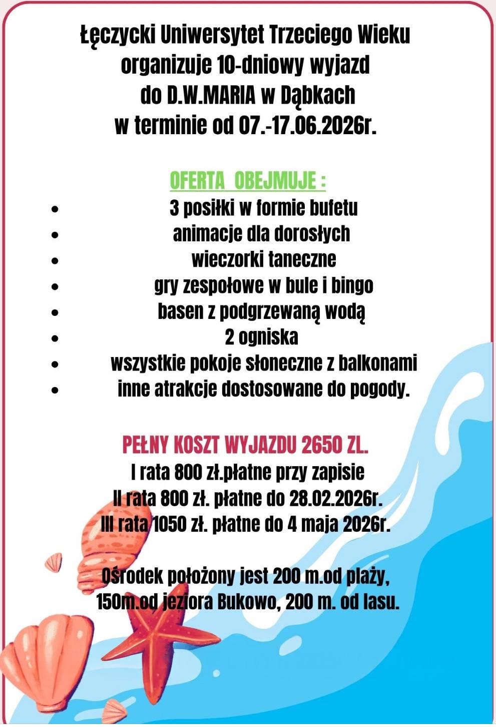 Łęczycki Uniwersytet Trzeciego Wieku informuje, że posiada kilka wolnych miejsc na wyjazd do Ośrodka Maria w Dąbkach w terminie 07-17 czerwca 2026.